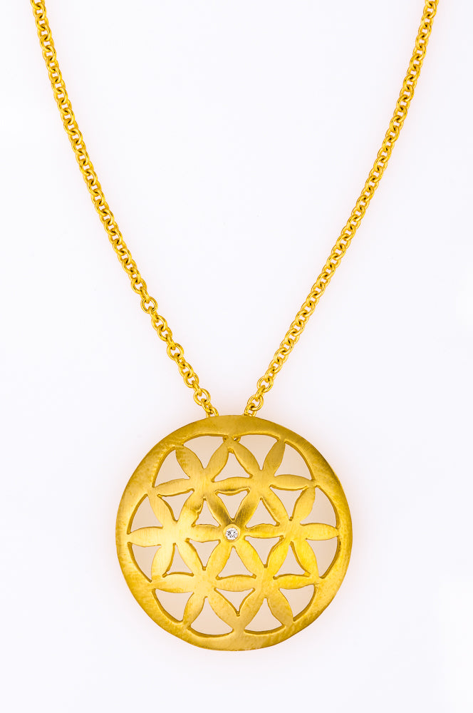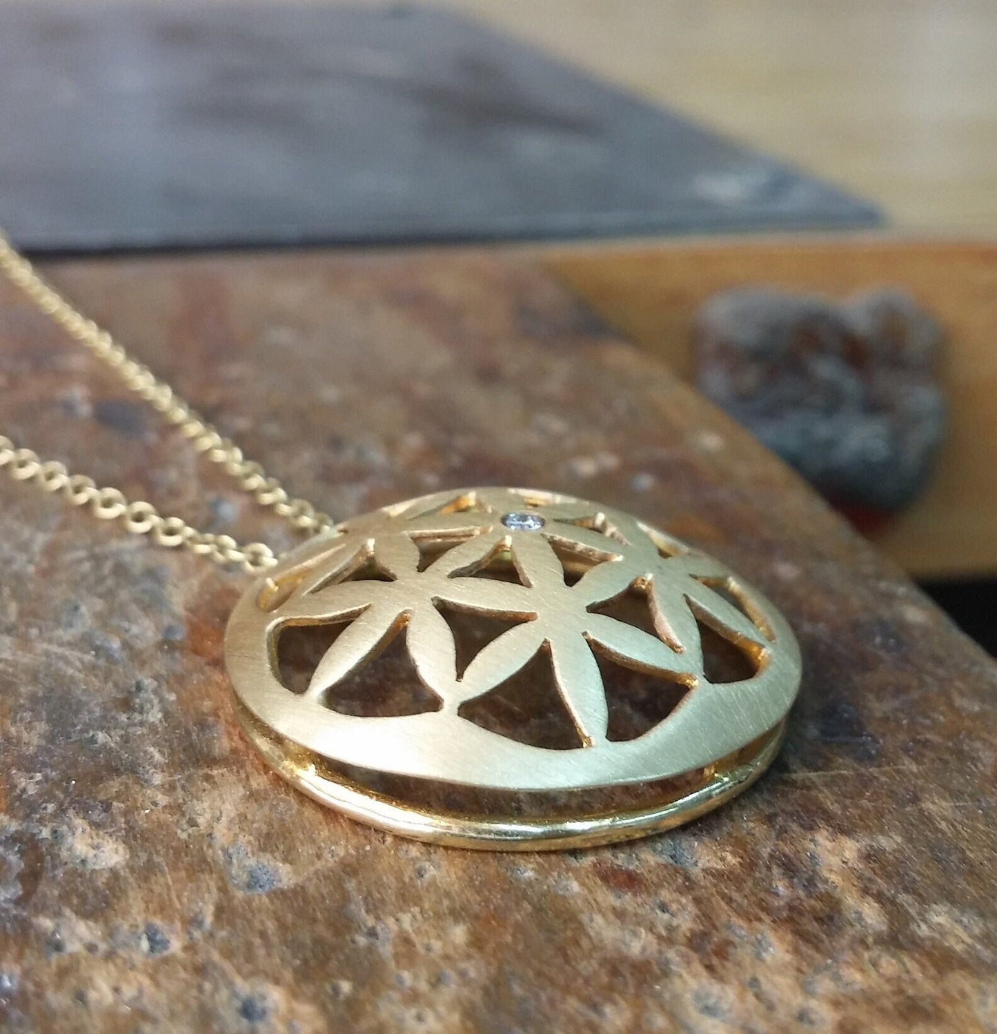 • The seed of life charm is curved made from 18K or 14K gold on a gold necklace.